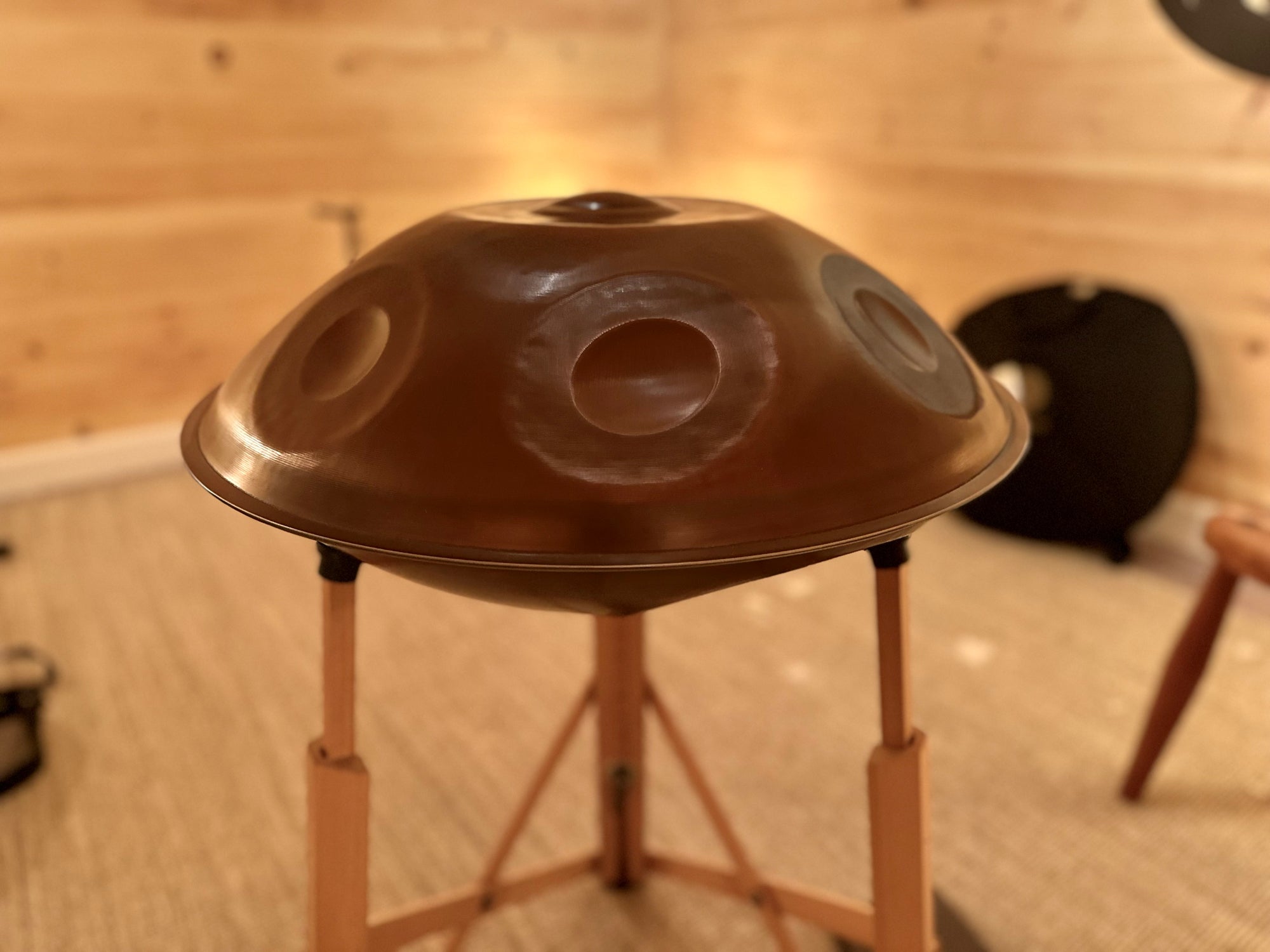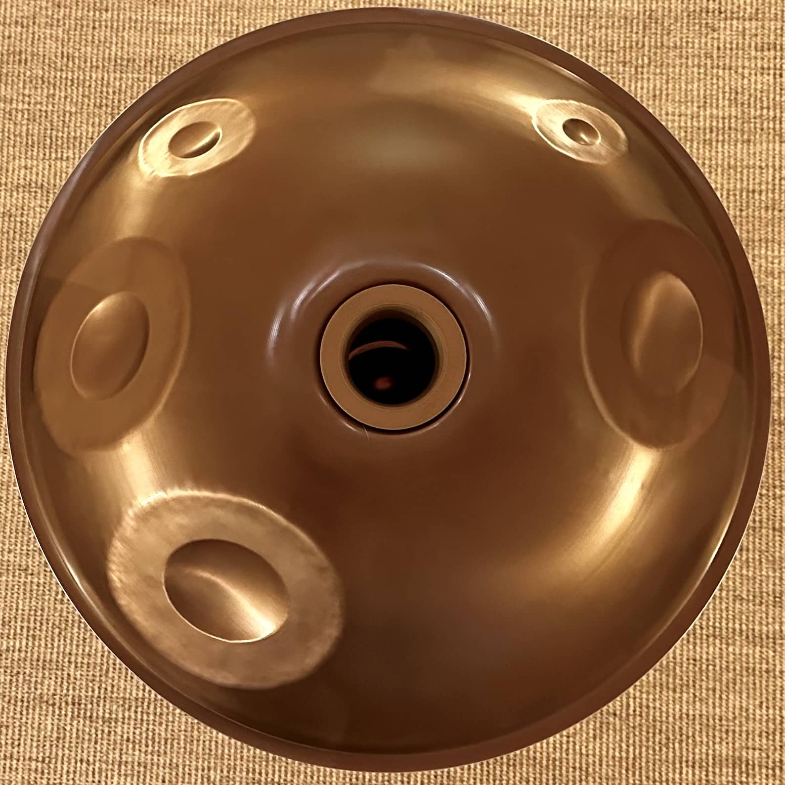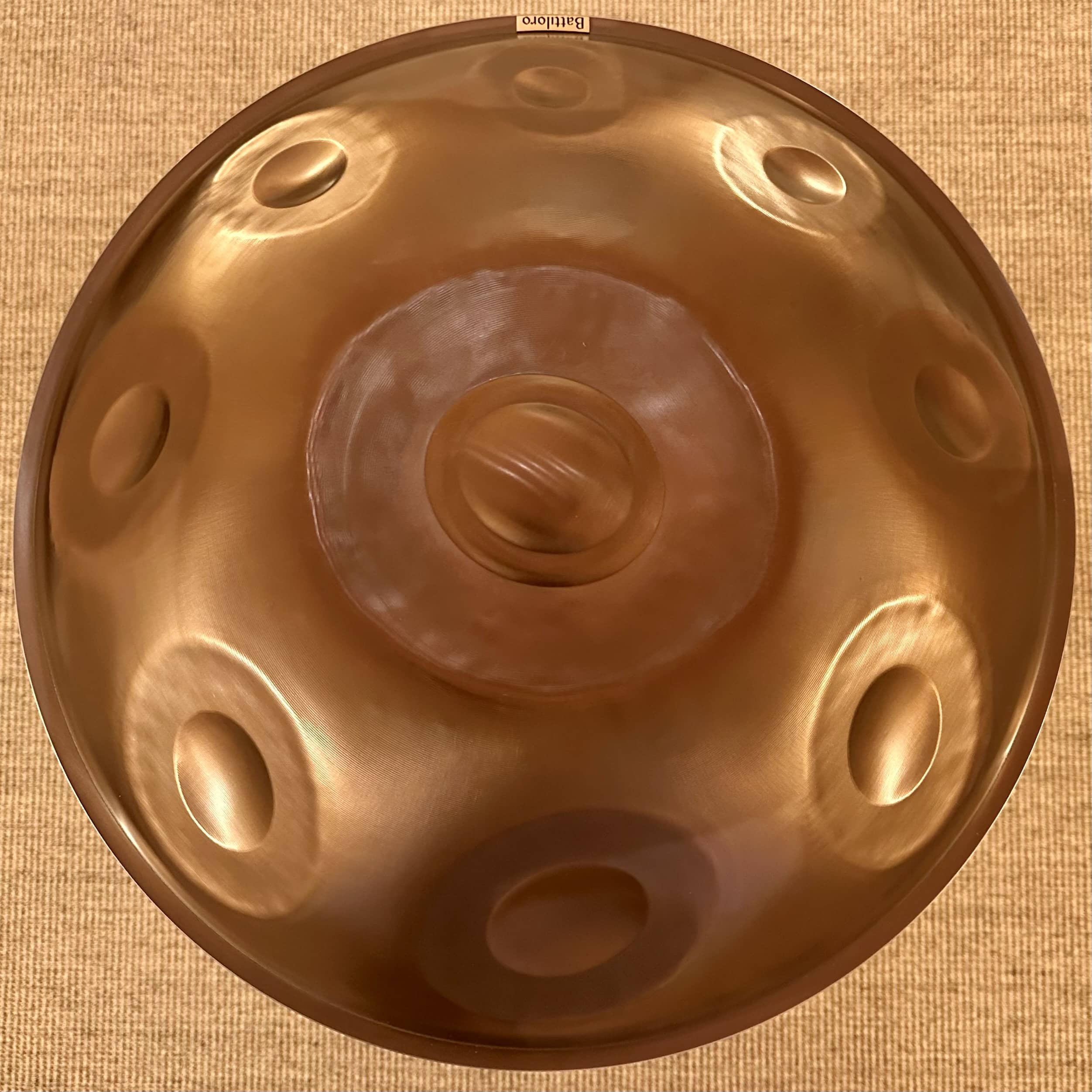 This is one of Battiloro's Mutant models, meaning it has a bunch of extra notes. In this case, they all live on the bottom shell, both high notes and low notes. There's a tension when choosing a handpan: More notes mean more complexity, but also more possibility. I personally prefer the extra notes—I feel like each added note dramatically increases my available melodies.