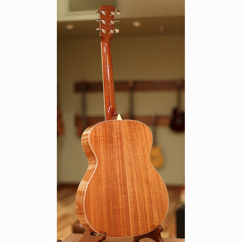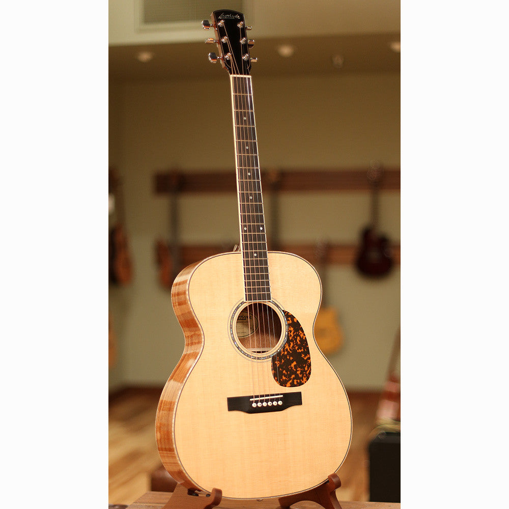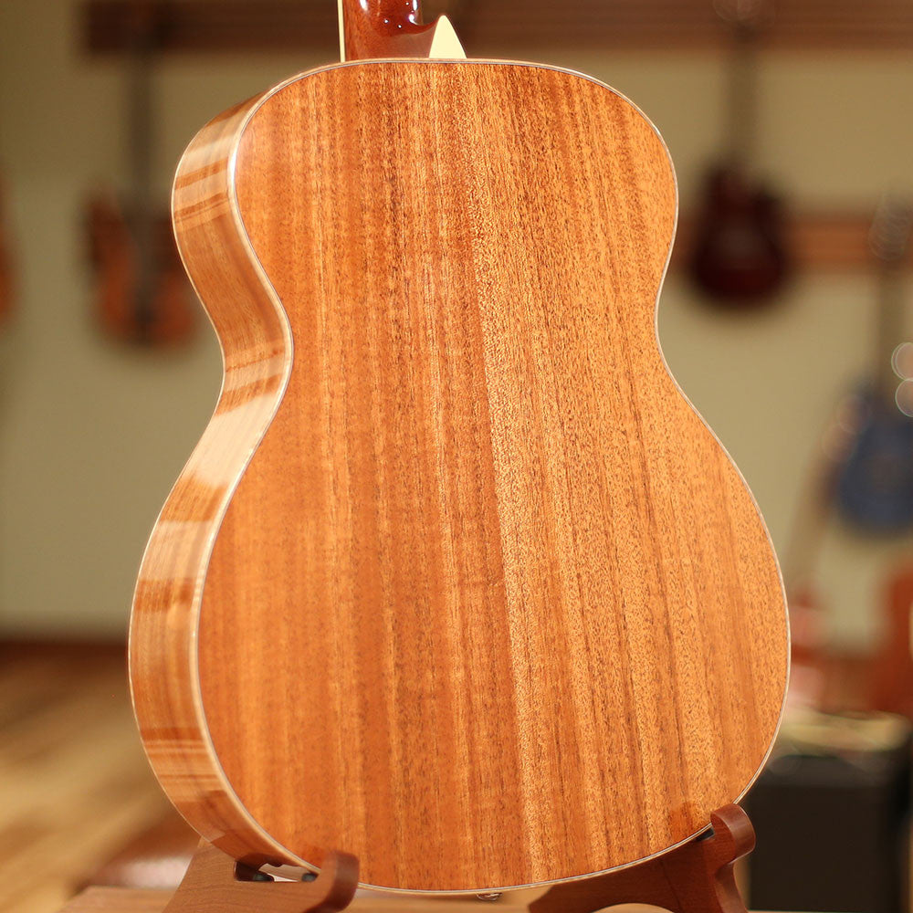 My OM-05 arrived recently, and I'm a little embarrassed by how it has drawn me away from my other guitars. The instrument looks like a supermodel, all sleek and glowing with its figured woods and smooth, glossy finish. I've never seen a prettier example of mahogany. The Sitka spruce top on my guitar has Bearclaw figuring, and it's such a regular pattern, it appears like a waterfall. Flamed maple binding jumps out at every viewing angle. The JCL logo tuners add a functional touch of class, smooth and unobtrusive in operation so you can get in tune and stay there.