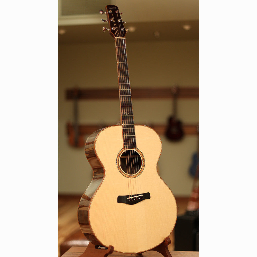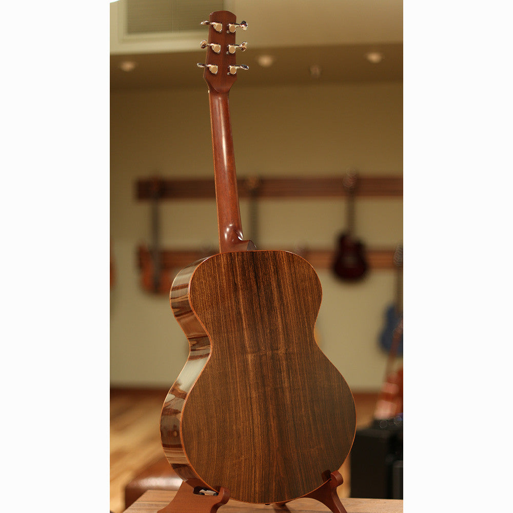 The High Noon listed here is the Kinscherff mini-jumbo model. It features a master-grade Adirondack spruce top, East Indian rosewood back and sides, and a cool spalted maple rosette. Put simply, it's the best guitar in our shop. There are a lot of fine instruments here, of course, but what really sets this instrument apart is its amazing ability to ring on every note. When the guitar first arrived, we spent hours playing it side by side with as many guitars as we could pull off the wall. And every time, we heard in the Kinscherff what we didn't hear in even our best guitars: Every string rings. It's almost like someone took the obsessive attention to balance that you find in a Larrivee, but injected it with just the right bit of the zing and note character you'd find in, say, the mashup of a Goodall, Mcilroy, and Northwood. The tone is lush without being boomy, and because every note stands out, it's like you're getting the double advantage of the note focus of mahogany and the reverb of rosewood.